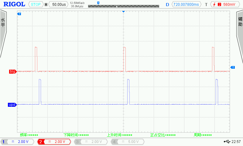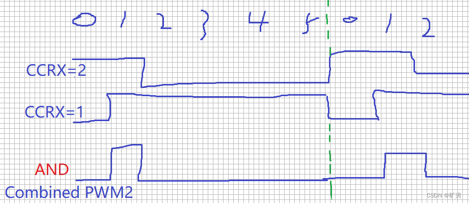 通道2配置为Combined PWM2,CCRX=1,此时通道2 OC2REF与PWM2相同,即计数值小于1时无效,输出低电平。