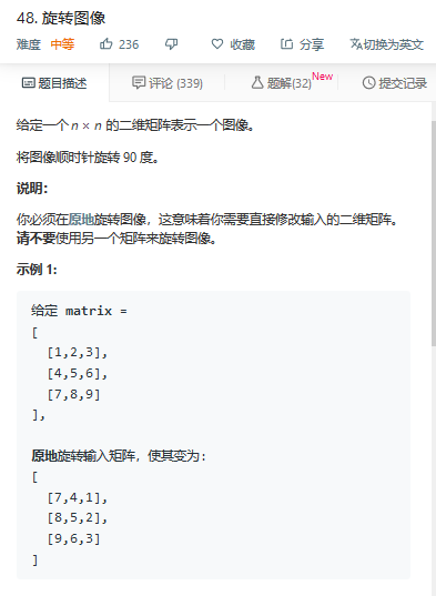 class Solution: def rotate(self, matrix: List[List[int]]) -> None: """ Do not return anything, modify matrix in-place instead. """ n = len(matrix[0]) for i in range(n // 2 + n % 2): for j in range(n // 2): tmp = matrix[n - 1 - j][i] matrix[n - 1 - j][i] = matrix[n - 1 - i][n - j - 1] matrix[n - 1 - i][n - j - 1] = matrix[j][n - 1 -i] matrix[j][n - 1 - i] = matrix[i][j] matrix[i][j] = tmp