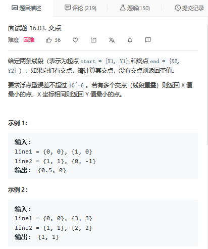 class Solution: def intersection(self, start1, end1, start2, end2): x1, y1, x2, y2, x3, y3, x4, y4 = *start1, *end1, *start2, *end2 det = lambda a, b, c, d: a * d - b * c d = det(x1 - x2, x4 - x3, y1 - y2, y4 - y3) p = det(x4 - x2, x4 - x3, y4 - y2, y4 - y3) q = det(x1 - x2, x4 - x2, y1 - y2, y4 - y2) if d != 0: lam, eta = p / d, q / d if not (0 <= lam <= 1 and 0 <= eta <= 1): return [] return [lam * x1 + (1 - lam) * x2, lam * y1 + (1 - lam) * y2] if p != 0 or q != 0: return [] t1, t2 = sorted([start1, end1]), sorted([start2, end2]) if t1[1] < t2[0] or t2[1] < t1[0]: return [] return max(t1[0], t2[0])