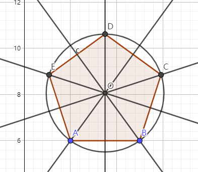 OA=OB=OC=OD=OE,AB=BC=CD=DE=EA,五个三角形全等,五边形的各个角相等。