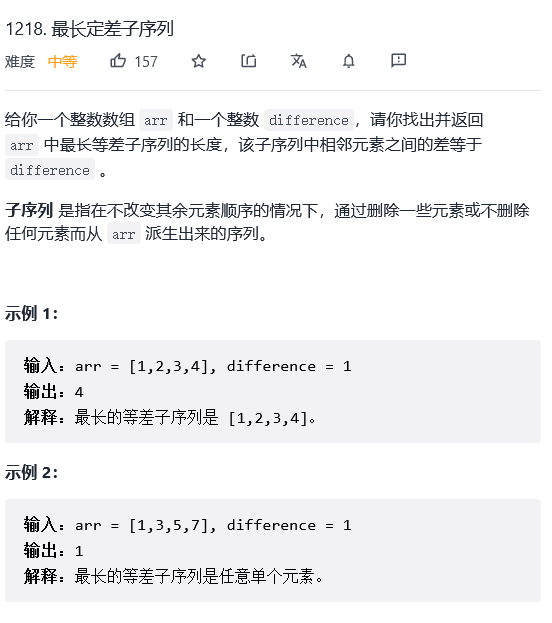 这里我们对于数组arr进行倒序遍历,这样好处是序列中元素的次序保持不变,每次操作的时候都询问当前的集合中,对于arr[i]+difference是否存在,存在的话,将这个序列的长度取出+1,加在当前的元素key对应的value处。