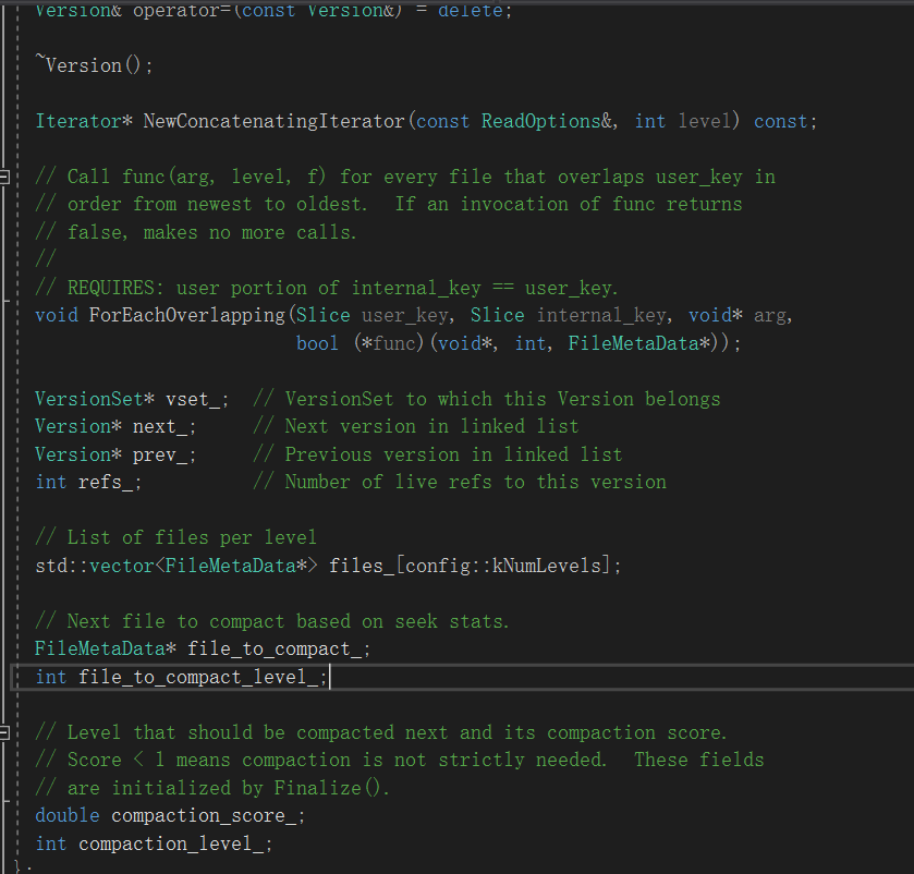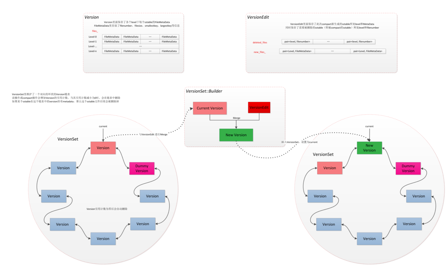首先是多个文件。LevelDB中用Version这个概念来管理当前某个时间点上的系统的文件:比如有哪些SSTable文件,每个SSTable文件的meta信息。Version 相关的类主要是 VersionSet、Version、VersionEdit。其中 Version 表示一个不可变的元信息版本,所有活跃的 Version 都包含在 VersionSet 的双向链表之中。每个 Version 有引用计数,在生命周期结束之后,会将自己从这个双向链表中摘除。