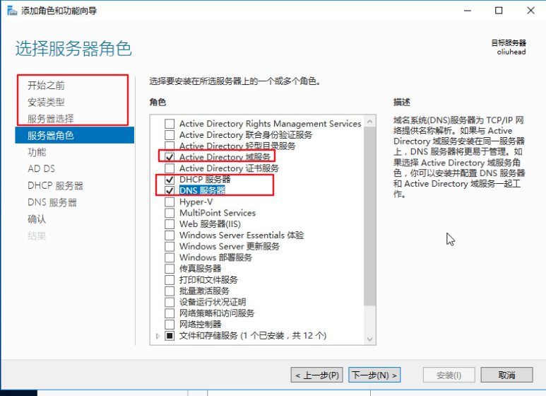 - 前三步点击下一步,到达服务器角色界面,选择Active Directory域,DHCP服务器,DNS服务器