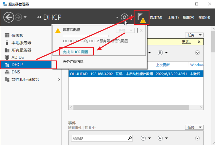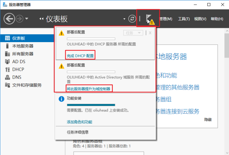 - 安装完成后,需要部署DHCP,DNS,以及将服务器提升为域控制器