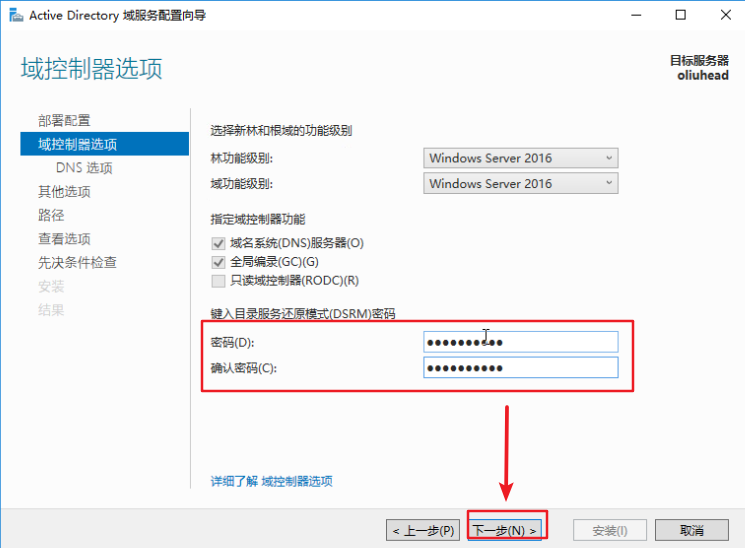 填写DSRM密码,这个密码是维护时使用的,很少用上