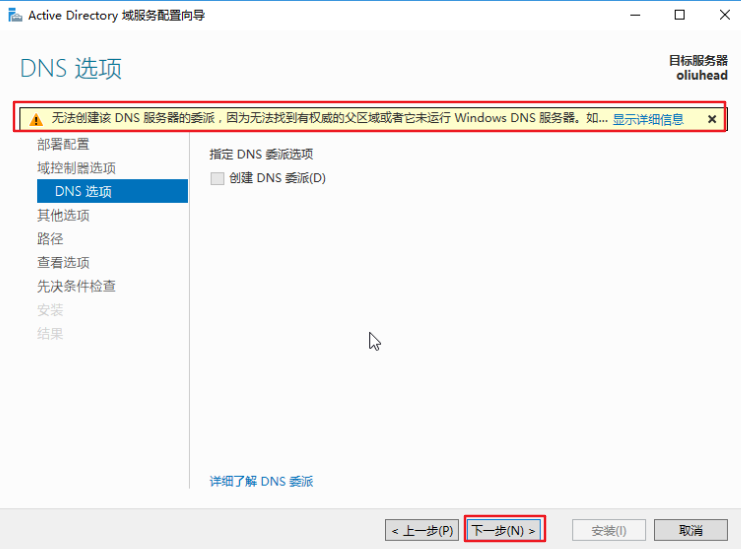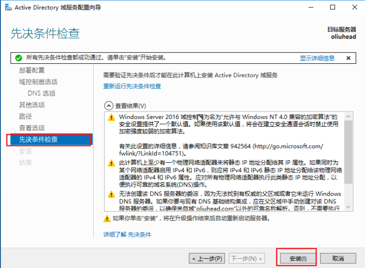 到达先决条件检查,直接选择安装,这样域控制器就提升完成