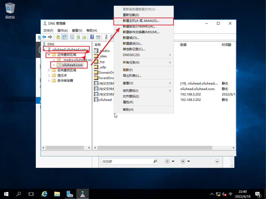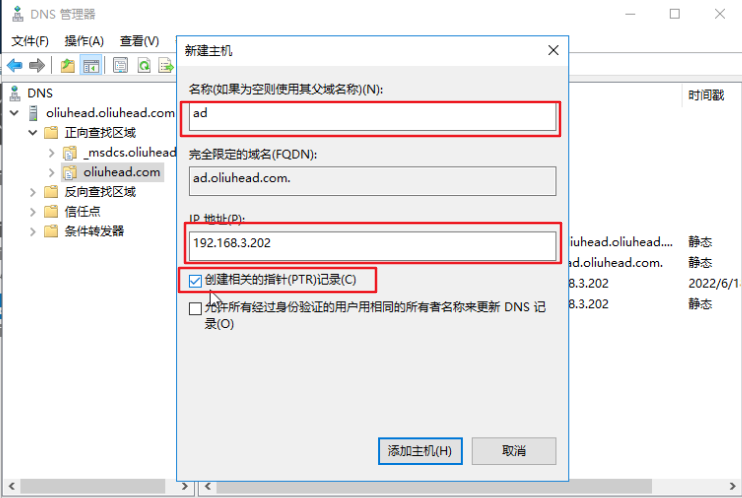 创建相关指针PTR记录,会将反向查找区域自动添加(正向查找是将域名解析为IP地址的过程,而反向是将IP解析为域名)