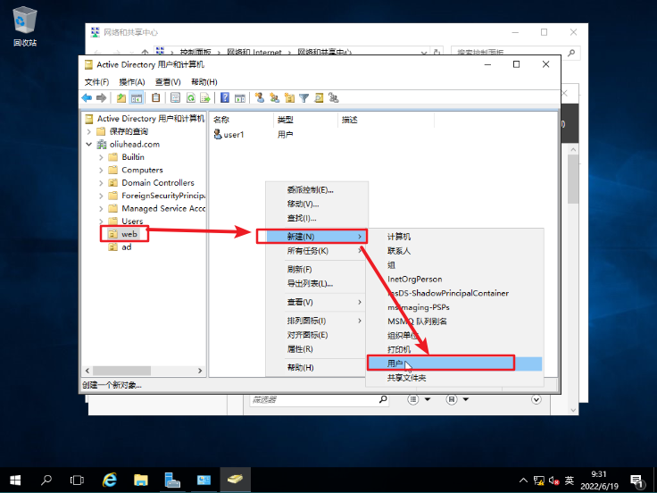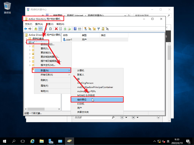- AD部署完成,在AD用户与计算机管理中可以添加隶OU(组织用户)