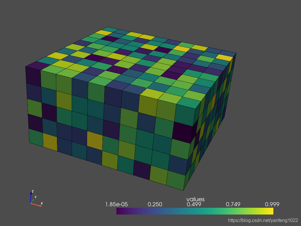 pyvista是对vtk的封装,使用更简单。下面是一个简单的测试,显示三维随机场数据,从文件读取三维矩阵数据,三维网格显示,以及三个方向的切片显示。