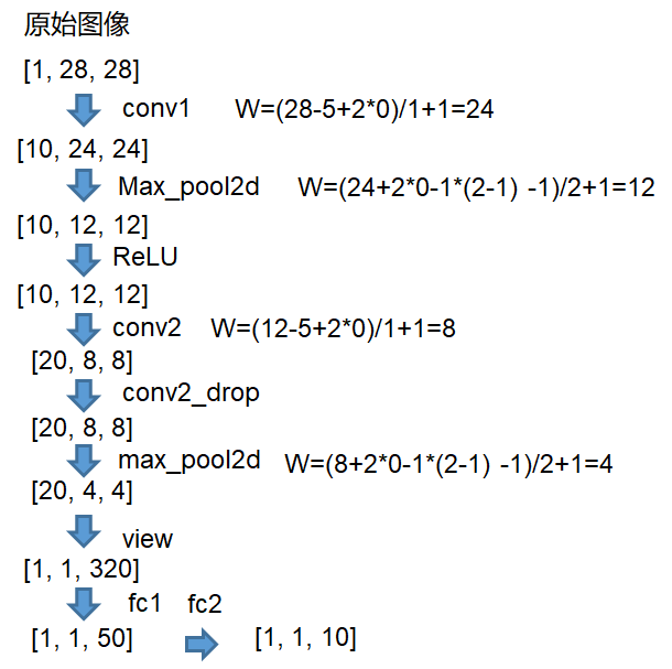 data-->conv1-->max_pool2d-->relu-->conv2-->conv2_drop-->max_pool2d-->view-->fc1-->relu-->dropout-->fc2