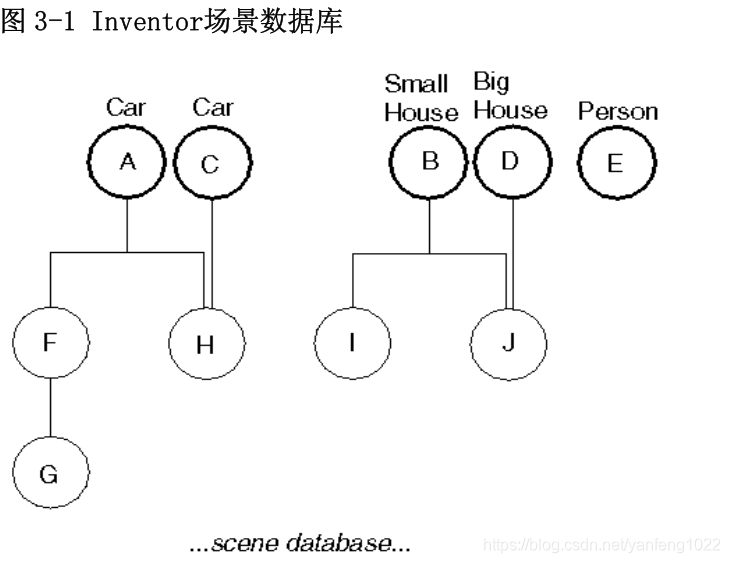 图 3-1 展示了一个包含有五个图形场景的简单数据库。图形场景中最顶层的节点称作根节点(节点 A 至节点 E)。请注意观察,节点 H 是如何连接到两个不同的父节点上的。这种情况叫做共享实例(shared instancing)。还请注意,节点 E 没有和数据库中任何其它的节点相连接。通常这只是一种临时的状态,随着不断地增加场景内容,这个节点就应该会和其它的节点相连接了。