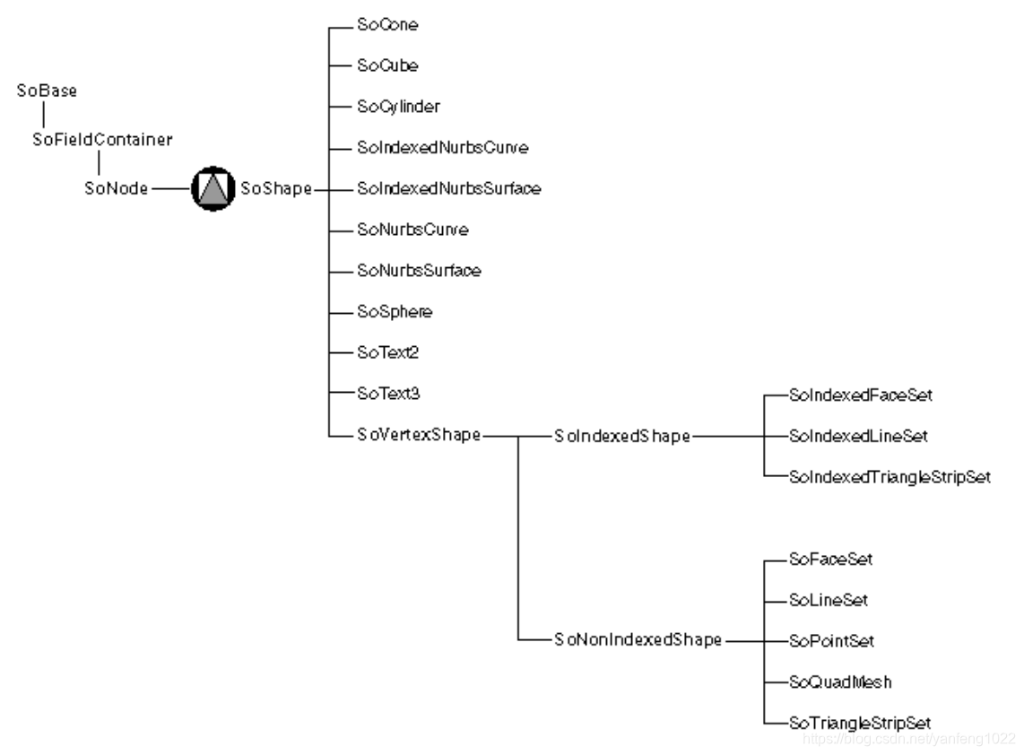 形体节点用于表示一种 3D几何对象。它们比较特殊,因为它们代表的是一些受属性节点和组节点影响的实际物体。在执行渲染动作期间,它们实际上会将自己形状绘制在屏幕上。形体节点类包括:SoSphere、SoIndexedFaceSet 和 SoText3 等类。图 3-2 展示了部分形体节点类的类树图: