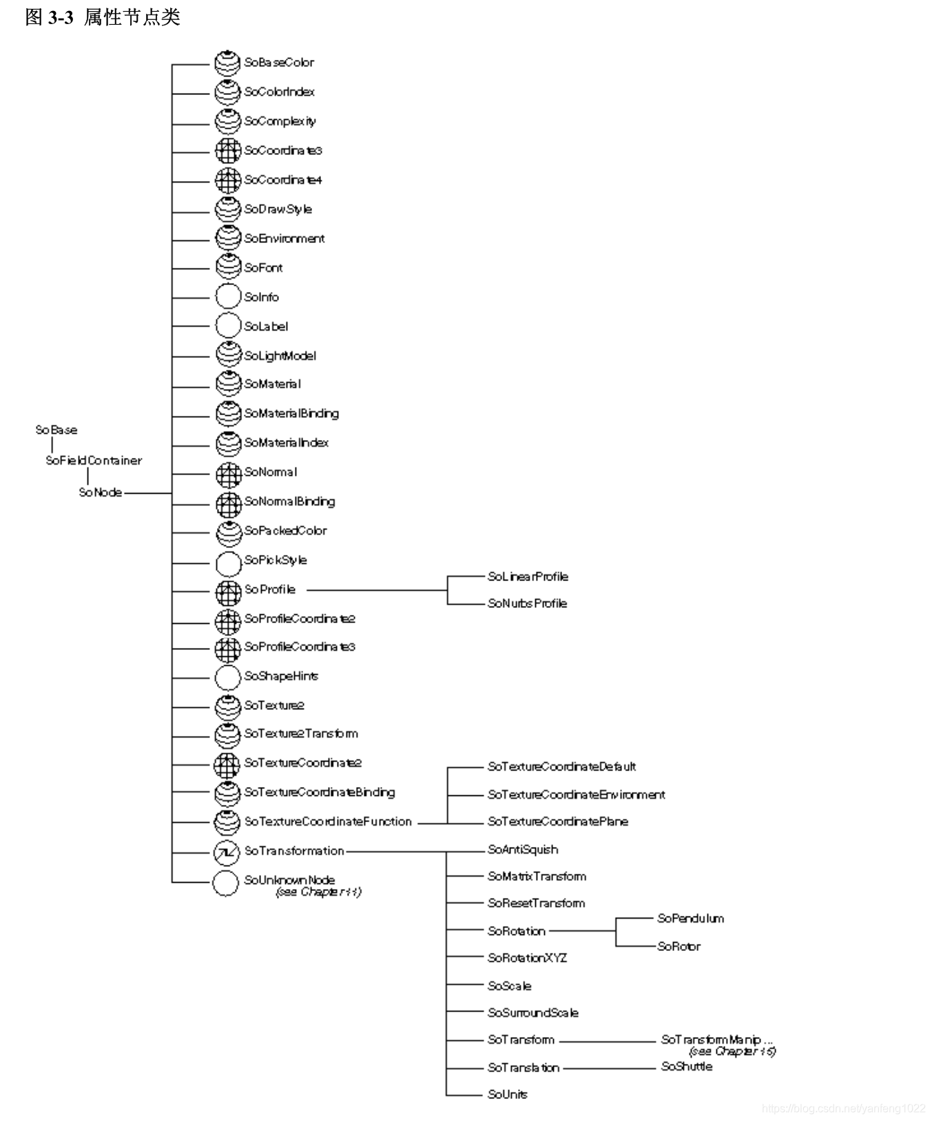 属性节点代表的是像“表面材质”、“绘制风格”、或“几何变换”等这些用于展现场景外观和特有性质的节点。图 3-3 展示了包含属性节点的部分类树图。属性节点可以分成若干类,场景图一般使用三种不同的图标来表示它们: