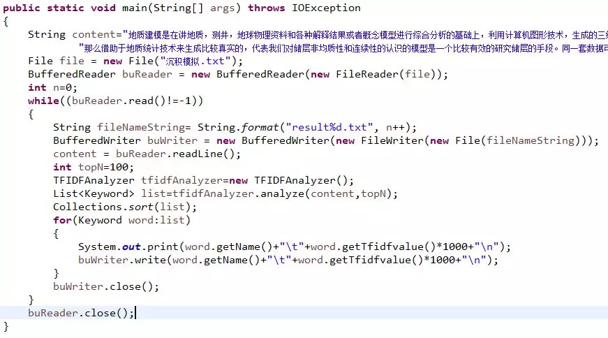 开源的中文分词包有很多,这次选用的分词算法库是结巴分词,它是非常流行的中文分词包,有多个语言的版本,这次采用了java版的。从结巴分词的github的主页上下载代码后,根据例子,填写少量代码就可以实现任意文本的分词。具体代码如下图,包括读取文件,调用结巴分词分析的类,执行分词,输出分词结果,保存到文件。得到的分词结果里包含词组的名称和出现的概率,可以用来做词云图。其中分词算法采用了tf-idf方法,它是一种基于统计的方法,具体原理看相关文献。