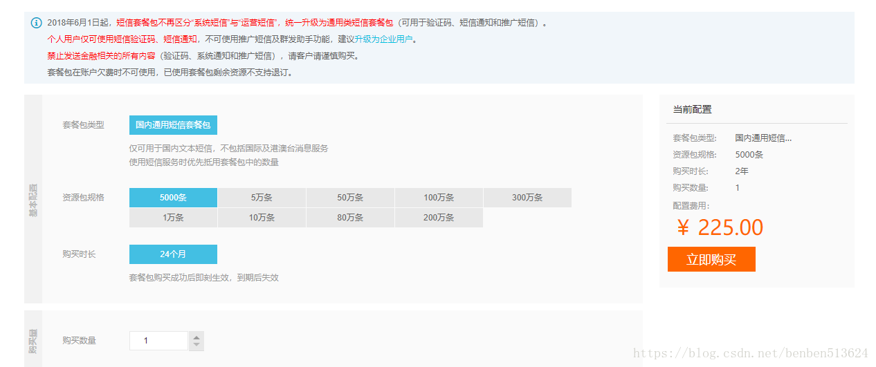 先购买短信,点击短信套餐包购买短信