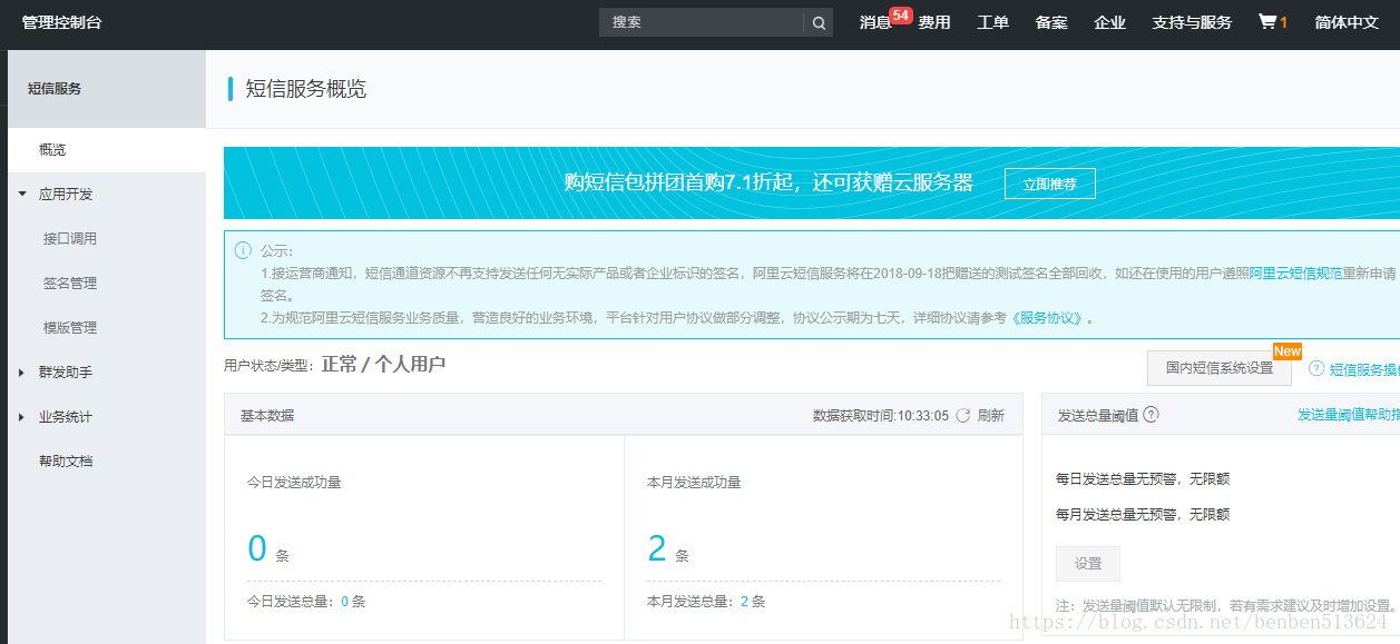 点击管理控制台,进入短信服务概览页面