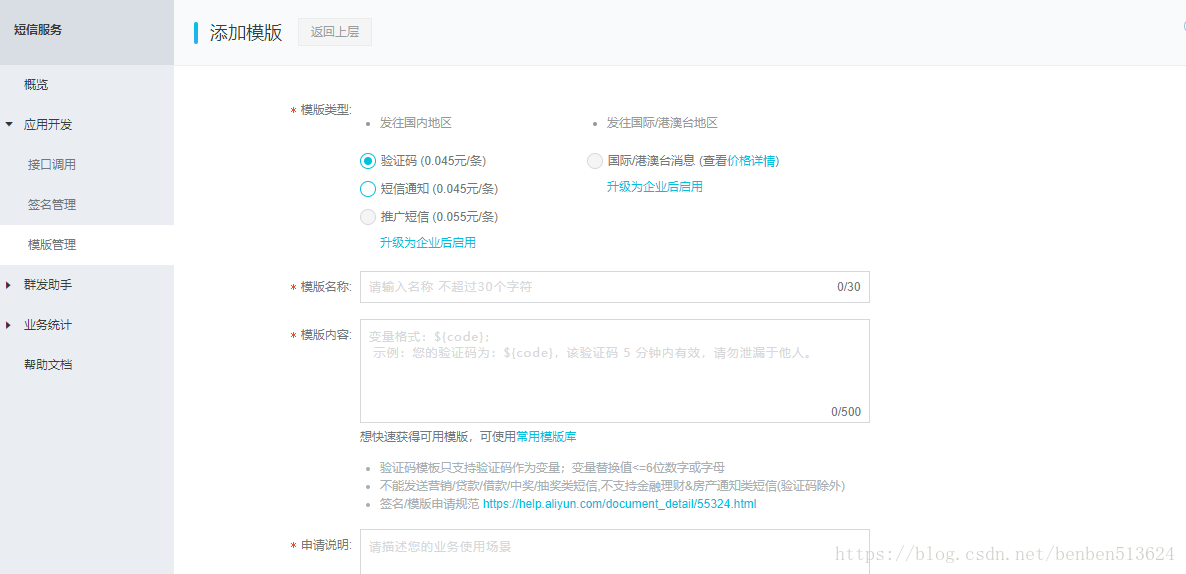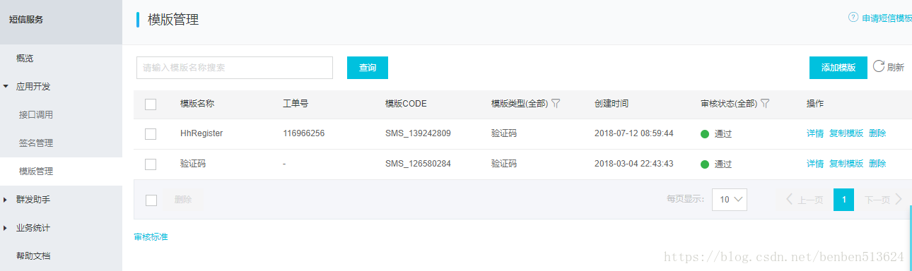 点击模板管理,设置短信模板,点击添加短信模板