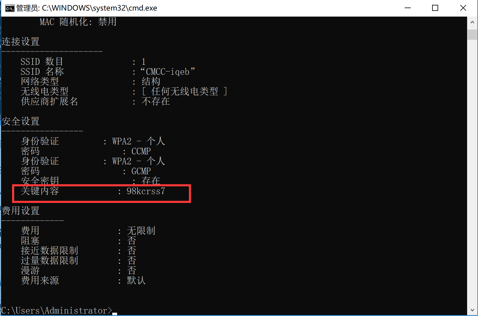 netsh wlan show profiles "cmcc-iqeb" key=clear