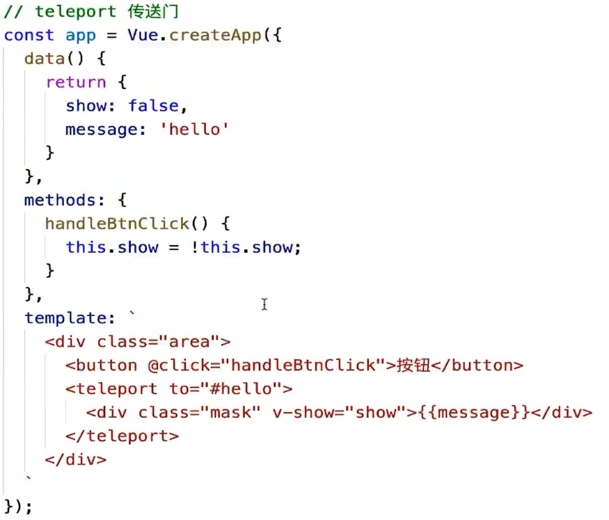 传送门可以把组件里的一些dom元素直接的传送到其他的位置(id='hello')进行展示,这个是一个很神奇的功能