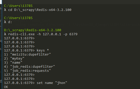 另启动一个cmd窗口,切换到redis目录下运行 redis-cli.exe -h 127.0.0.1 -p 6379 。如下,表示启动完成。之后就可进行Redis操作了。