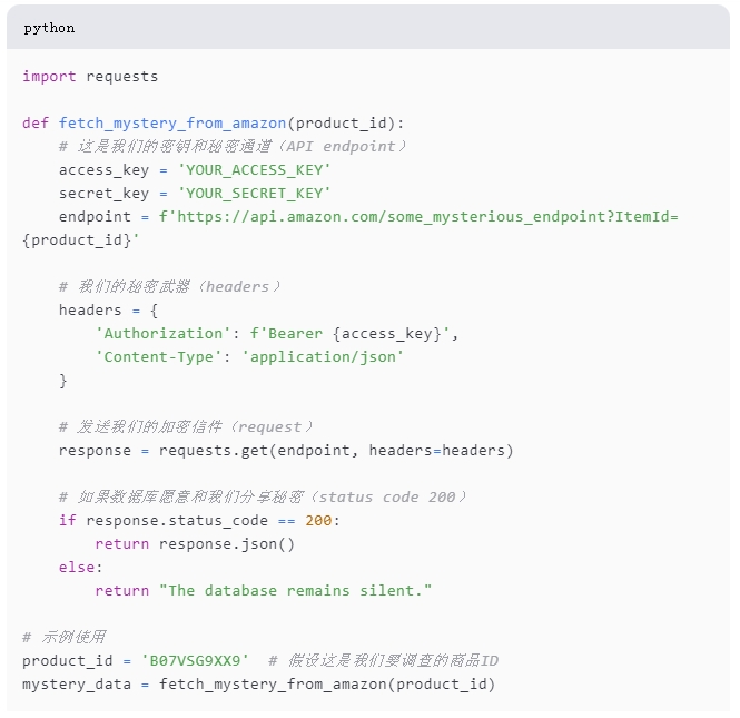 首先,我们需要开启我们的“X档案”,也就是发送请求到亚马逊的API。这个过程就像是向神秘的数据库发送一封加
