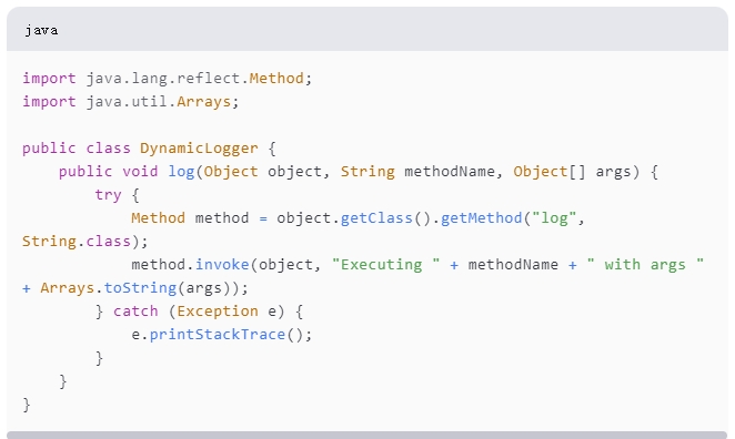 而不需要硬编码日志语句。以下是一个简单的代码示例,展示了如何使用反射API来动态记录日志: