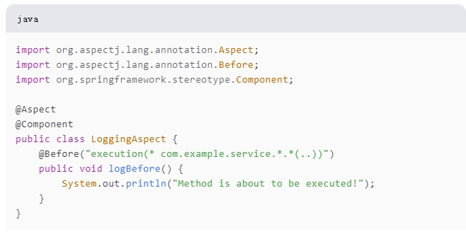在这个例子中,LoggingAspect 类定义了一个切面,它会在指定包下的所有类的所有方法执行前打印日