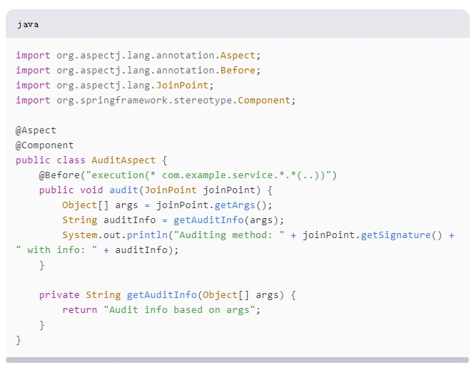 在这个示例中,AuditAspect 类定义了一个切面,它会在方法执行前根据传入的参数动态生成审计信息