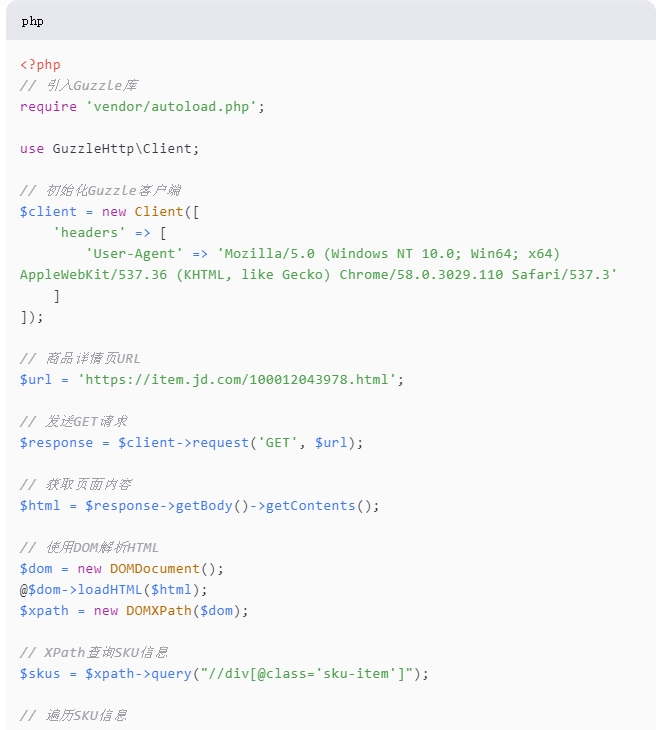 以下是一个简单的PHP爬虫示例,用于获取京东商品的SKU信息: