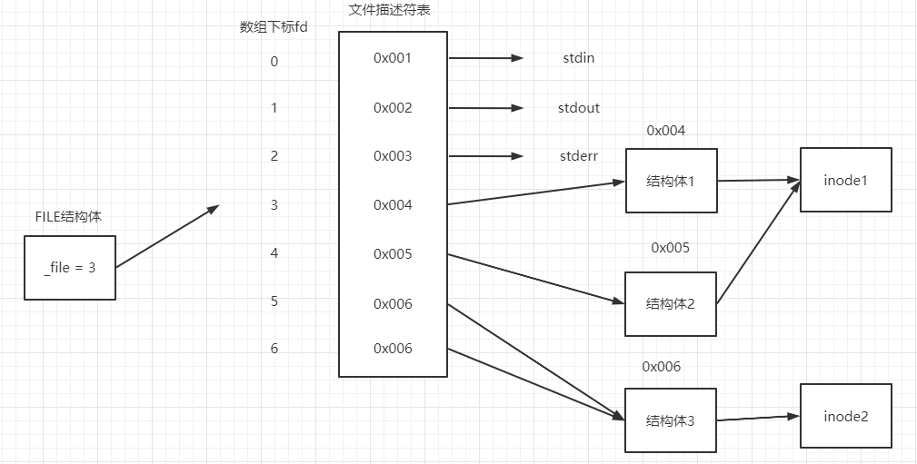 _file就是整型数组下标fd,即文件描述符 - 每打开一个新文件,则占用一个数组空间,而且是空闲的最小的数组下标。即文件描述符优先使用当前可用范围内最小的。同一个文件可以被多次打开,但是每打开一次都需要一个新的文件描述符和新的结构体,例如图中的结构体1和结构体2,指向了同一个inode;