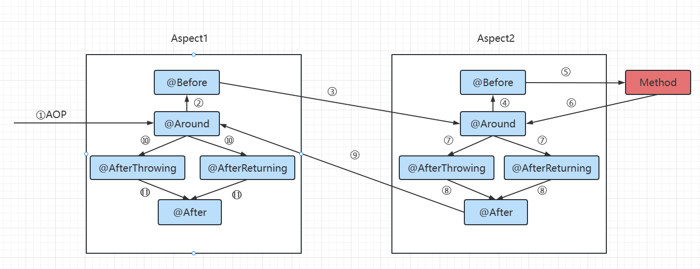 假设Aspect1的优先级顺序高于Aspect2,通知顺序图如下: