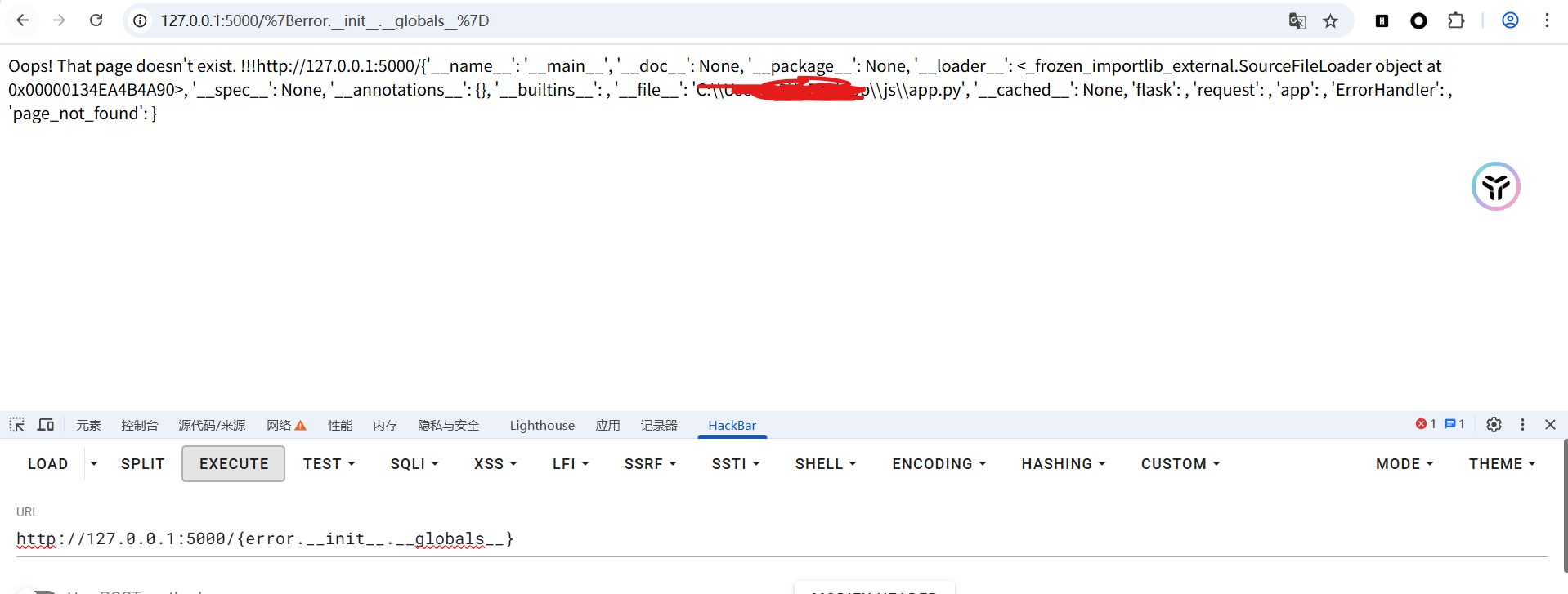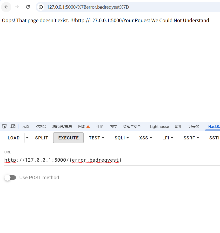 但是由于这里只是字符串拼接,而不是用模板引擎渲染的,且Python 内置的format()方法只能访问对象的公开属性(如error.notfound),无法执行任意代码或访问全局变量。所以打不了ssti