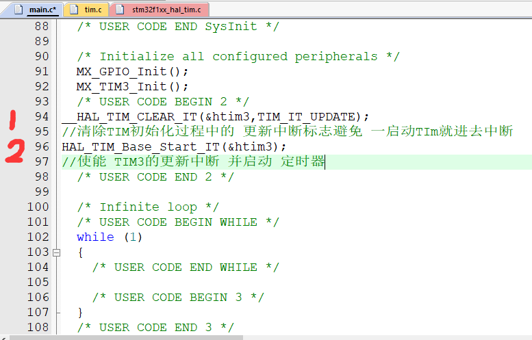 (1) __HAL_TIM_CLEAR_IT(&htim3,TIM_IT_UPDATE); //清除TIM初始化过程中的 更新中断标志避免 一启动TIm就进去中断