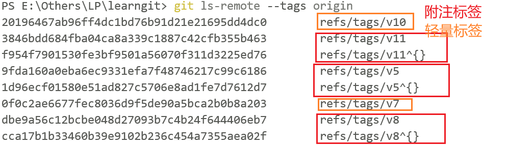 查看远端标签时,可以看到的附注标签和轻量标签之间的区别