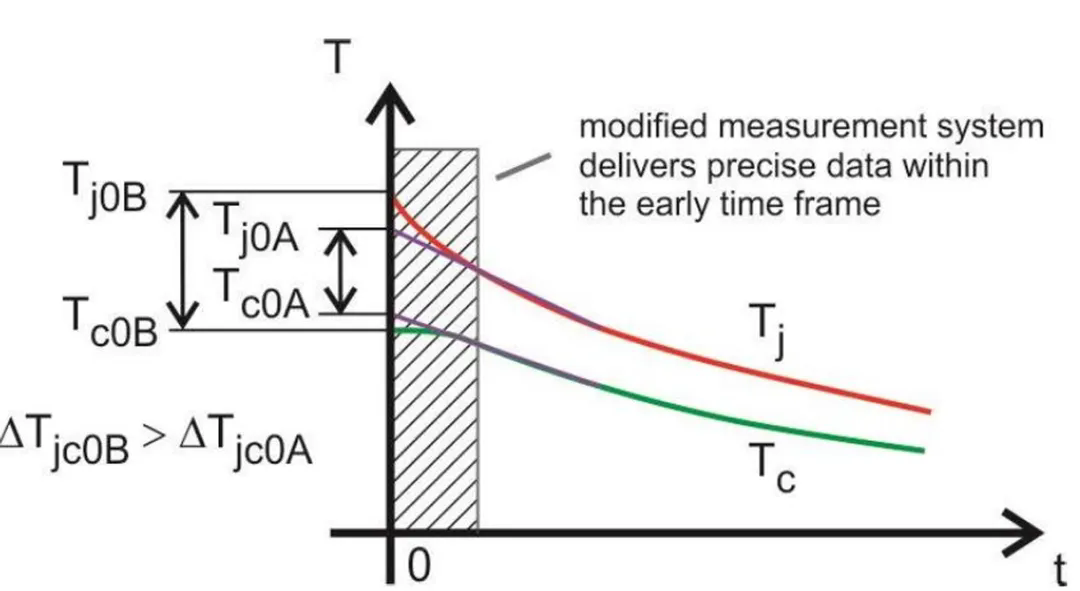 图七对此进行了简化描述。与以前的测量系统"A"相比,修改后的测量系统"B"在t=0时Tj和Tc之间的差值更大。如图一所示,这一温差与热阻Rth成正比,同时也会影响热阻抗Zth。