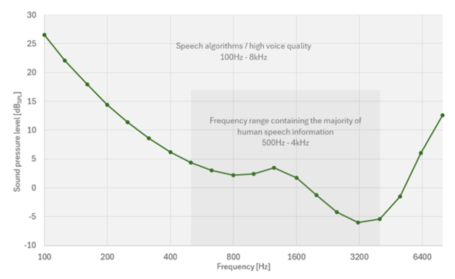 从科学的角度来看,人耳基于两个关键因素来感知音频信号:频率和声压级。声压级 (SPL) 以分贝 (dBSPL) 为单位,表示围绕环境大气压振荡的声压幅度。100dBSPL的声压级相当于割草机或直升机发出的巨大噪音。声压级范围内的最低点 (0dB) 等效于20µPa的声压振荡,这代表具有最佳听力的健康年轻人在1kHz频率下的听力阈值。所有与语言有关的人类声音都属于100Hz至8kHz的频段。根据ISO226:2023标准,相应的人类听力阈值如图1所示。