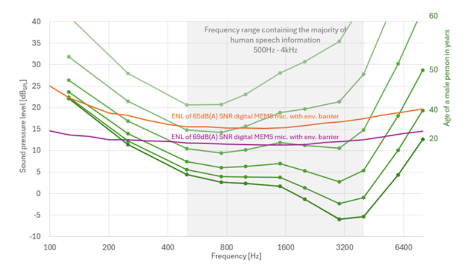 图3 中端和高端MEMS麦克风的1/3倍频程等效噪声级ENL与典型男性听力阈值的比较。