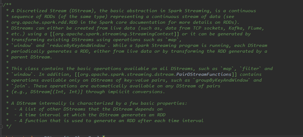 所谓DStream,用中文来说就是离散数据流。上面是源码中DStream类的一段注释。它说是SparkStreaming里面一系列RDD的基本抽象。DStream是一个时间上连续接收数据但是接受到的数据按照指定的时间(batchInterval)间隔切片,每个batchInterval都会构造一个RDD,因此,Spark Streaming实质上是根据batchInterval切分出来的RDD串,想象成糖葫芦,每个山楂就是一个batchInterval形成的RDD。我来理解就是同一空间内不同时间内的数据流。