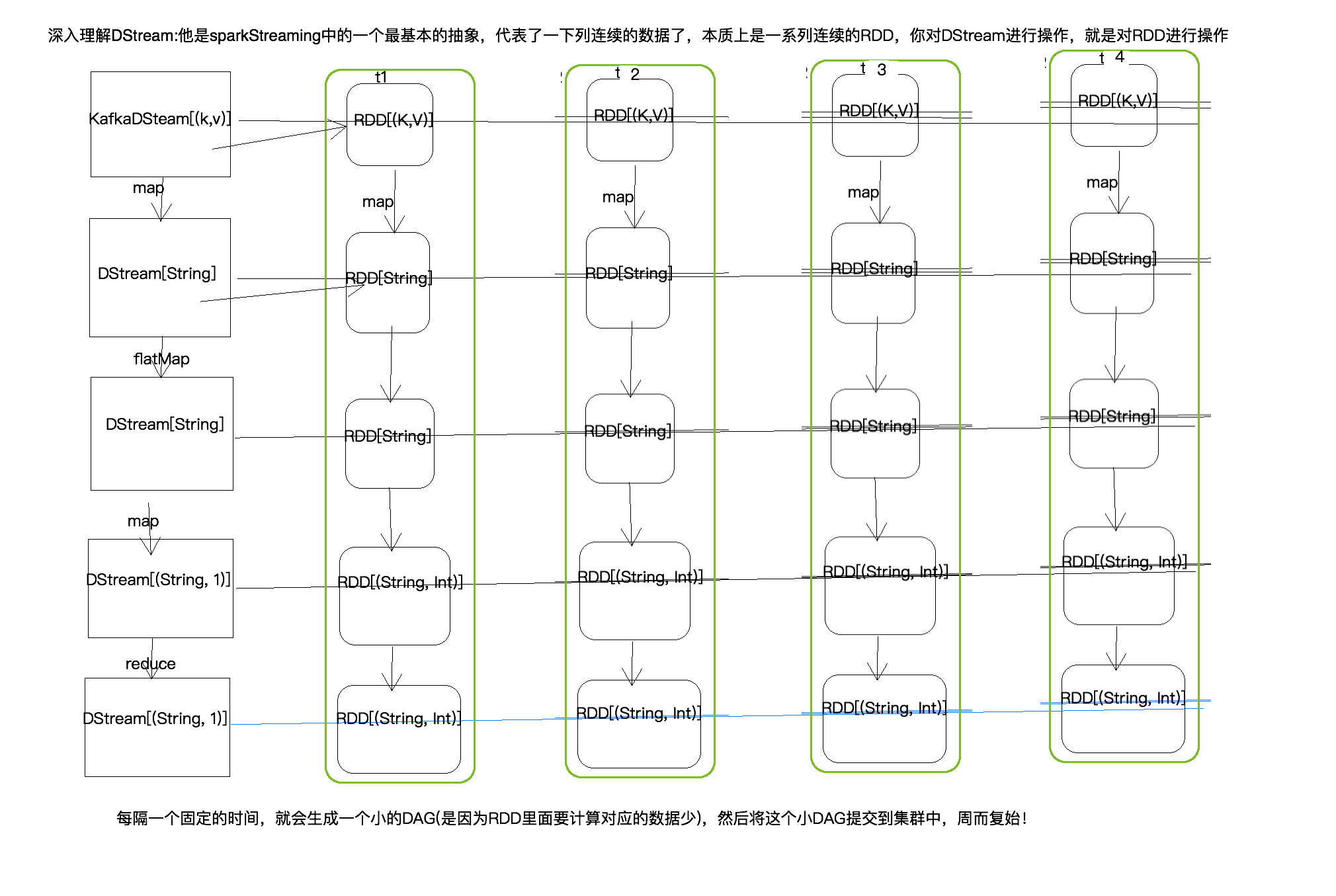看这个官网来的图片,它所显示的应该是在time1来了一个RDD,而在time2来了一个RDD.......在time4又来了一个RDD
