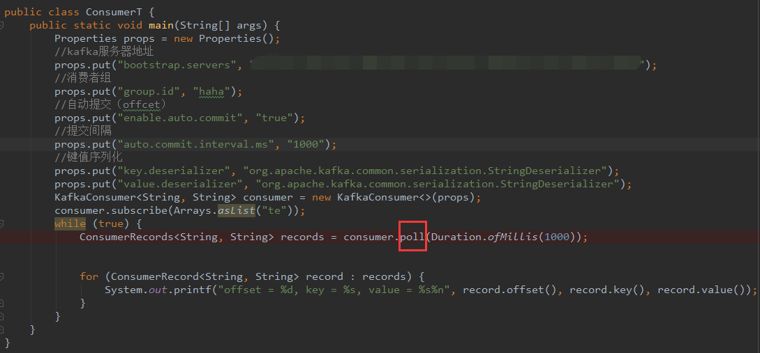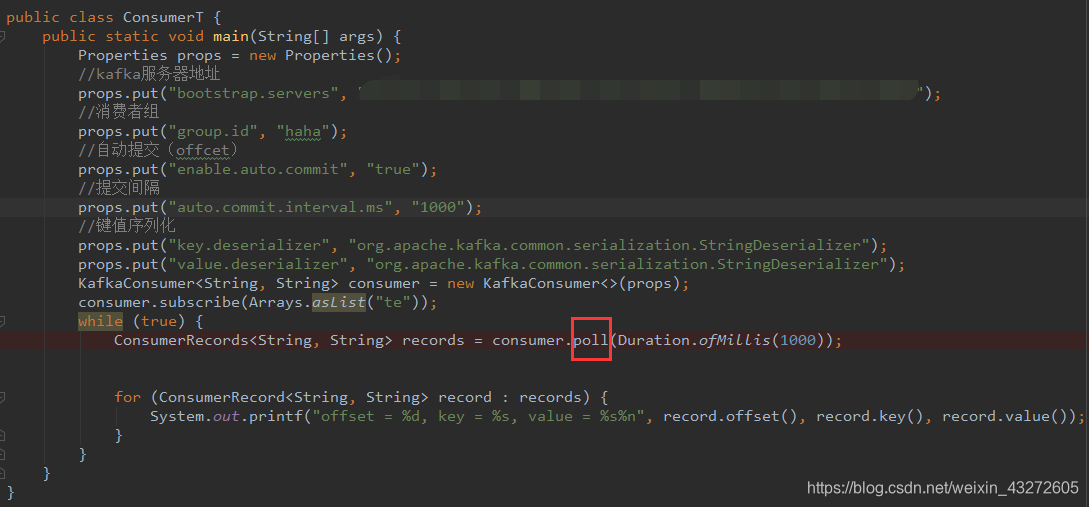 前不久,想写写kafka的consumer,就按照官方API写了下面这一段代码,但是总是打印不出东西。返回的records是没有东西的。于是就研究了一下这个poll方法到底是怎么执行的。调试了很久,终于弄清楚了哪里有问题
