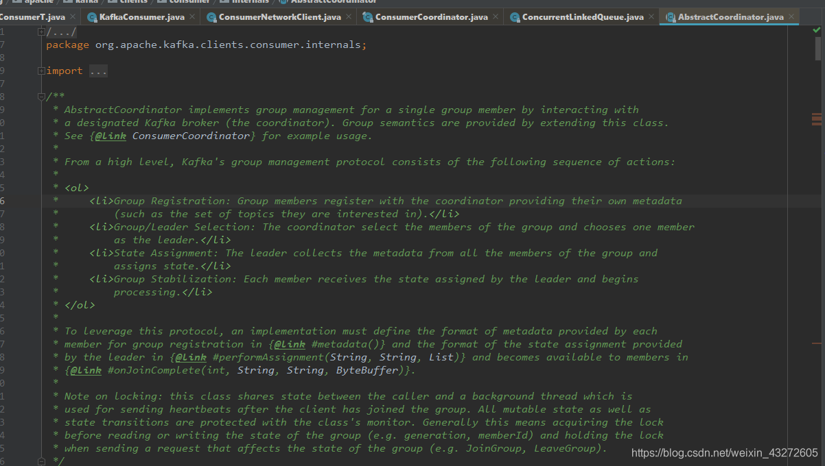 这是AbstractCoordinator源码的一段注释,它告诉了我们broker的coordinator的一些知识点