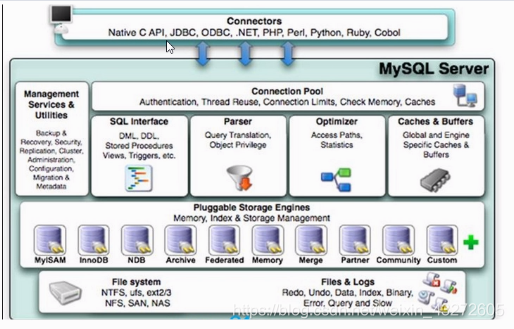 最上层就是一些客户端和连接服务,包含本地sock通信和大多数基于客户端/服务端工具实现的类似于tcp/ip的通信,主要完成一些类似于连接处理,授权认证,及相关解决方案,在该层上引入了线程池的概念,为通过认证安全接入的客户端提供线程。同样在该层上可以实现基于SSL的安全连接。服务器也会为安全接入的每个客户端验证所具有的操作权限
