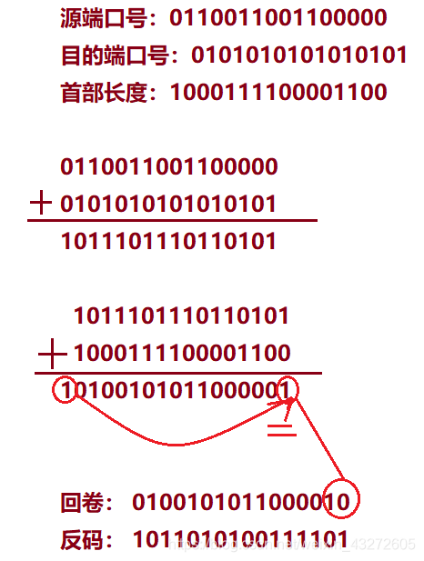 校验和就是将源端口号,目的端口号,首部长度进行二进制加法,然后做反码,这个反码结果就是校验和
