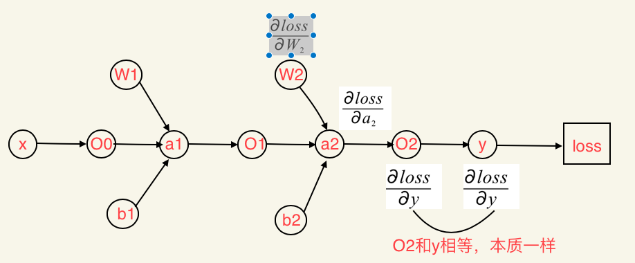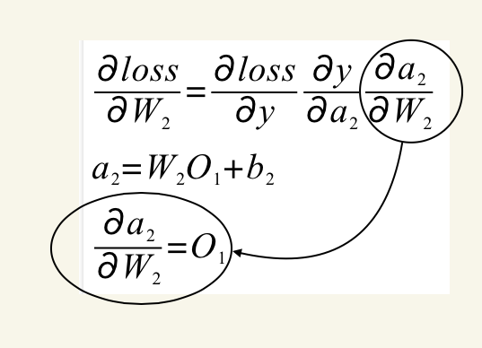 这里我们因为loss和y有直接关系,那么loss可以对y求导,而y(O2)与a2有直接关系,那么y可以对a2求导,a2又可对W2求导