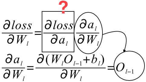 比如说,怎么根据来更新W(l)的值。其实和上面的一样,同样可以根据a(l)和W(l)的关系,然后这里的话,就先不是loss和O(l)而是loss和a(l)的关系求导,待会儿可以有个巧妙的地方。
