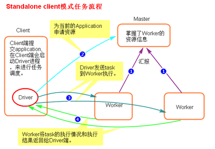 - 客户端提交一个Application,在客户端启动一个Driver进程。