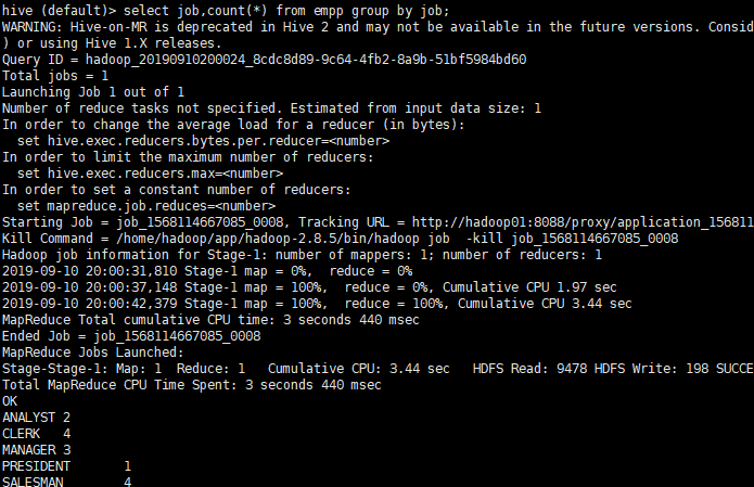 这里就会有猜测,到底一个组里面,这么多ename,到底要打印哪个ename,这里hive为了避免这种猜测,就认为这种形式是不符合规范的,所以,我们在进行group by时,一定不能出现这种情况。除非,我们使用了其他的聚合函数,比如count,sum,min,max等等,能够从一个组中挑选某一个确定值,这样同样可以避免这种猜测,就能够执行。
