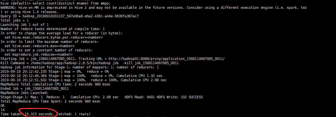 比如面这个使用select count(distinct ename) from empp;我们可以看到数据量太小了map和reduce都只有一个,从而只需要15秒