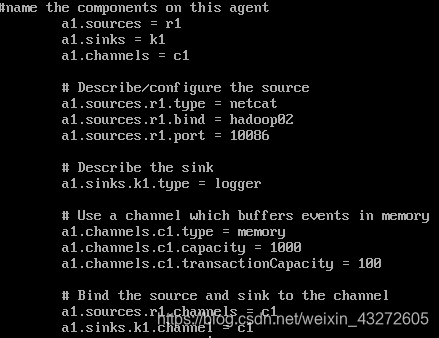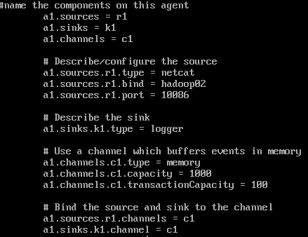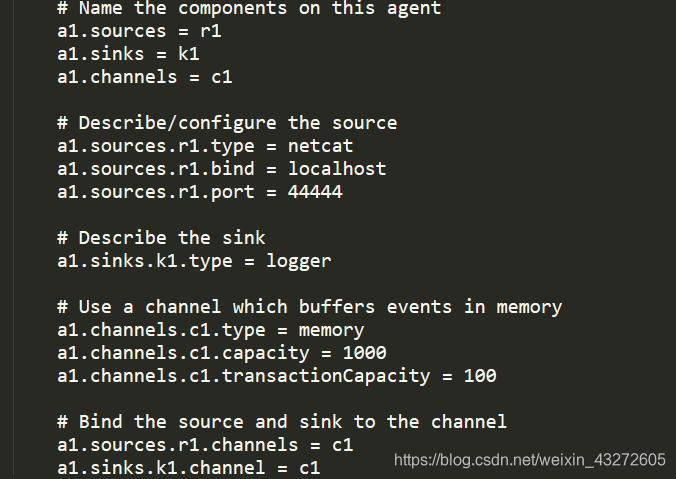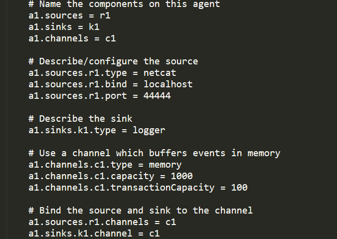 a1就是我们给Agent取得名字,而Agent有三个Component(Source,Channel,Sink)