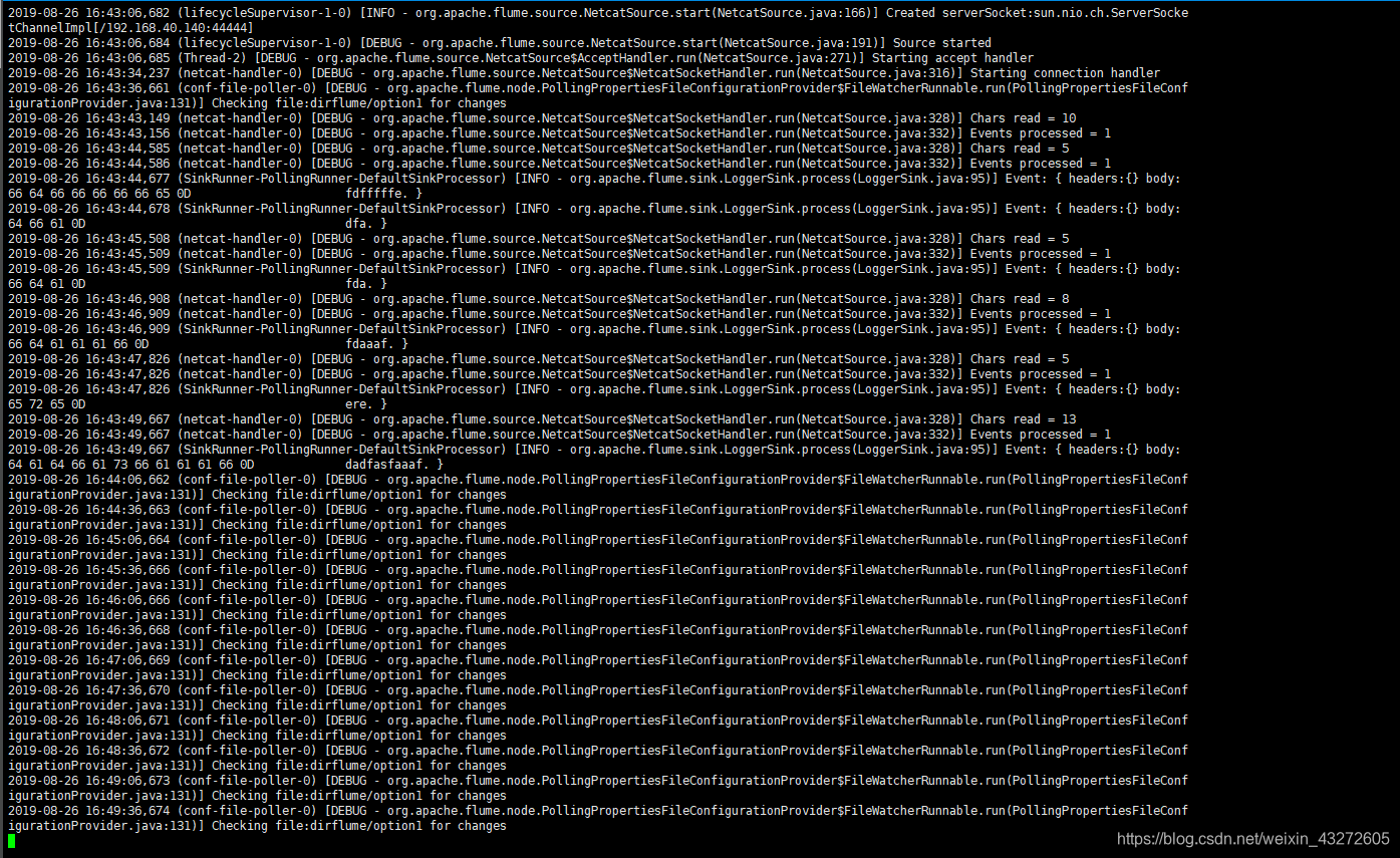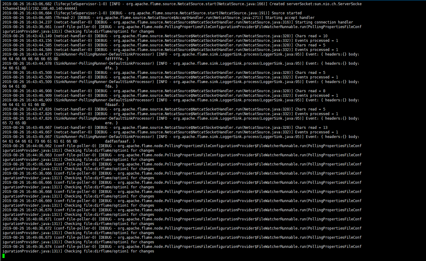这个配置内容等会儿解释,来测试测试内容,这里监听的是本地的44444端口,然后向本地44444号端口发送消息